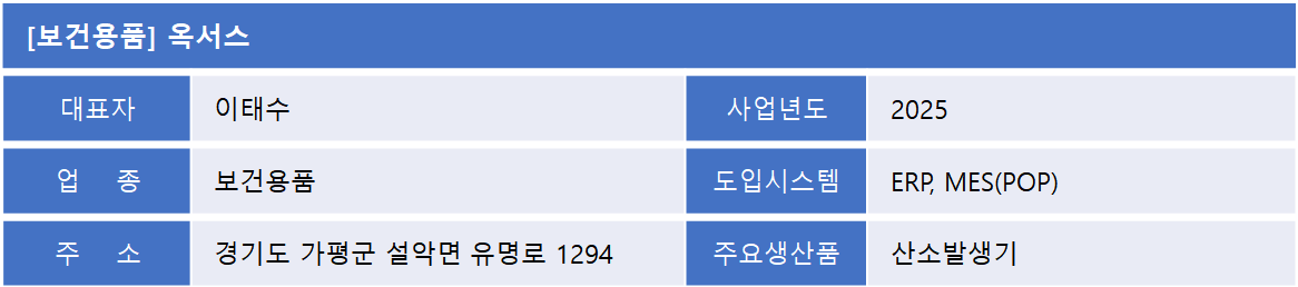 이를 해결하기 위해 '25년 스마트공장 구축사업에 참여했으며, 삼성전자 ESG&스마트공장지원센터의 위원들이 옥서스의 제품 생산의 전체 공정 프로세스를 개선하기 위해 생산성, 품질, 물류, 안전환경 등 총 50건의 과제를 발굴했다.