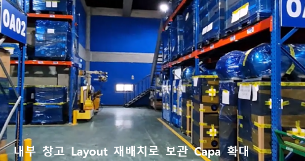 창고 공간 부족 문제를 해결하기 위해 Pallet Rack 적재 단수를 3단에서 4단으로 늘리고, 옥외 창고 면적을 160 Pallet에서 277 Pallet로 확대했다. 창고 Layout 재배치를 통해 In/Out Bound Gate를 분리 운영함으로써 물류 혼잡과 대기 Loss를 개선했다. 이러한 노력으로 적재 효율이 73% 향상되었으며, 내부 창고 Layout 재배치로 Capa가 160에서 196 Pallet로 증가했다.