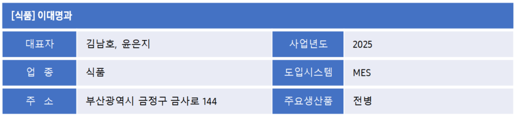 부산에서 70년 전통을 이어온 전병 전문기업 (주)이대명과는 전통 수제 방식의 강점을 유지하면서도 생산성과 운영 효율을 높이기 위해 스마트공장 구축에 참여했다. 삼성 대·중소 스마트공장 지원사업을 통해 제조 현장의 불합리 요소를 개선하고 물류 및 포장 공정을 중심으로 생산 혁신을 추진했으며, 데이터 기반 관리 체계를 마련하는 성과를 만들었다.