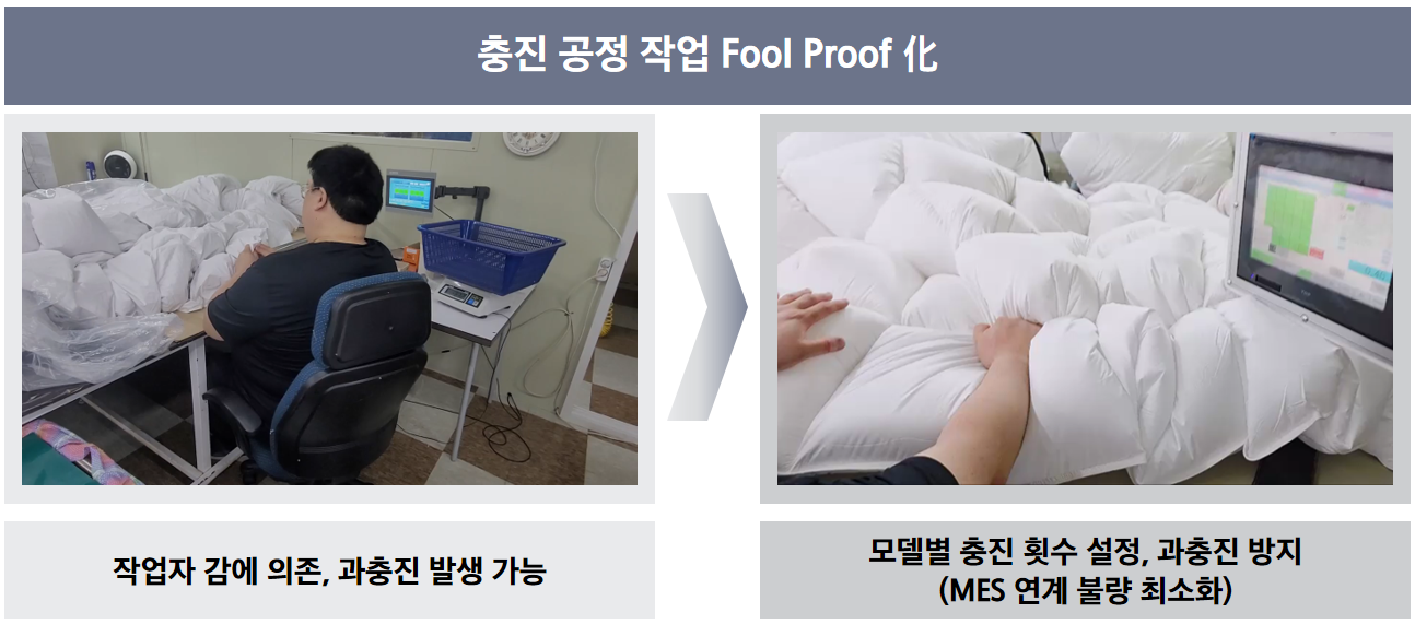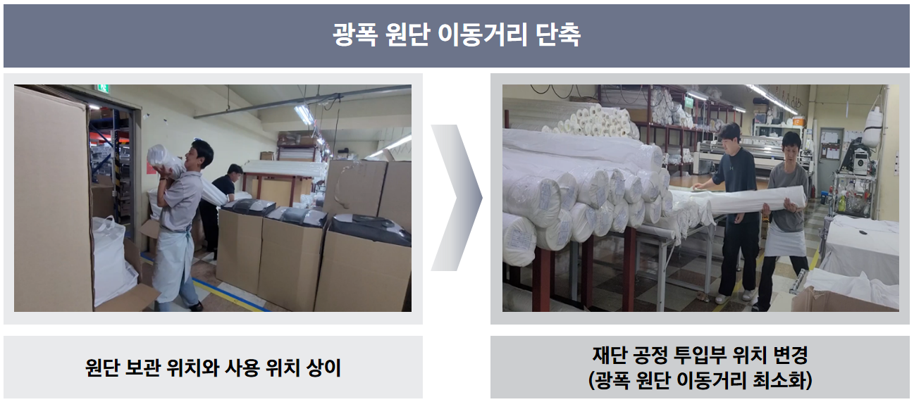 이러한 변화는 실제 성과로도 이어졌다. 생산성 측면에서는 베개 충진 작업 시 무게 측정을 위해 이동하던 시간이 완전히 제거되었고, 공정 효율 개선을 통해 조립 라인의 생산성이 약 14% 향상되었다. 또한 원단 이동 거리는 약 48% 줄었고, 충진재 누설분 수거 시간도 약 67% 단축되었다. 물류 영역에서는 반품 구역 재정비와 보관 방식 개선을 통해 약 15.75㎡의 공간을 새롭게 확보했으며, 원자재 이동 시간도 약 29% 감소했다. 품질 측면에서는 충진재 입고량과 사용량 간 중량 차이가 1,500g에서 750g으로 줄어 약 50% 개선되었고, 공정 내 과다 충진이나 불량 발생을 사전에 방지할 수 있는 체계가 구축되었다. 또한 반품 구역 분리를 통해 불량품 혼입 문제도 해소되었다. 안전 환경에서는 창고 2층에 안전 펜스를 설치함으로써 작업자의 추락 및 낙하 사고 위험을 제거하는 성과를 거두었다.