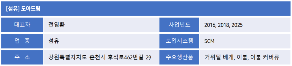도아드림은 1995년 설립 이후 거위털 베개와 이불, 커버류를 생산하며 꾸준히 성장해 온 기업이다. 강원도 춘천시에 기반을 두고 있으며, 국내 유통 비중이 99%에 이를 정도로 안정적인 판매 구조를 갖추고 있다. 하지만 이러한 안정적인 기반과는 별개로, 제조 현장에서는 점차 개선이 필요한 문제들이 드러나고 있었다. 특히 원자재 입고량과 실제 사용량 사이에 차이가 발생해도 그 원인을 명확히 파악하기 어려웠고, 생산품과 반품이 명확히 구분되지 않아 품질 관리에도 부담이 있었다. 도아드림은 이러한 문제들이 단순한 불편을 넘어 제조 경쟁력에 영향을 줄 수 있다고 판단했고, 이를 근본적으로 개선하기 위한 방법으로 삼성 대·중소 상생형 스마트공장 지원사업에 참여하게 되었다.